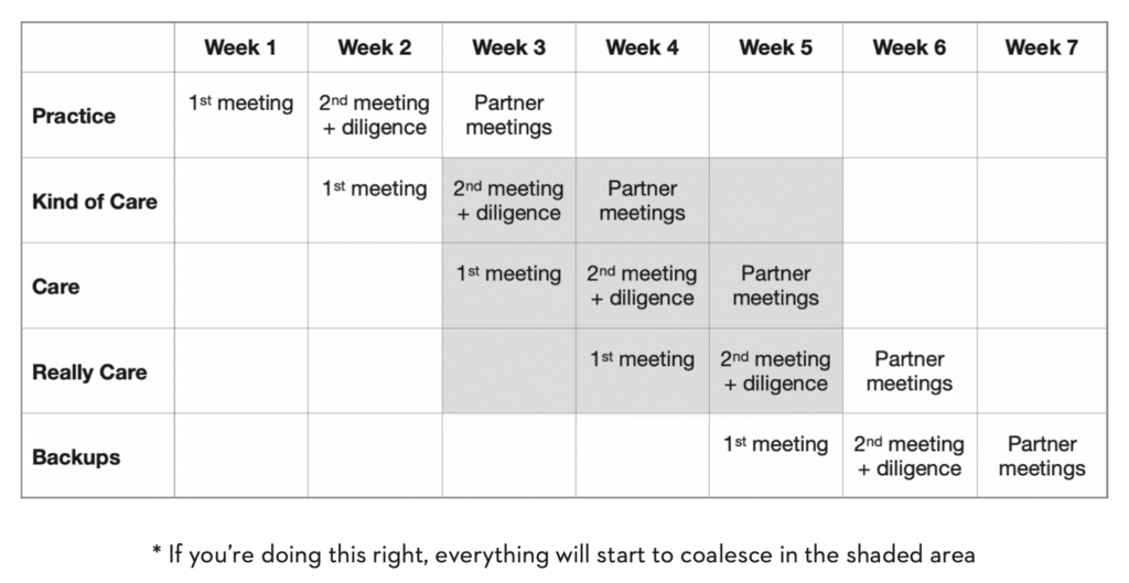 Remember—investors want to defer saying yes for as long as possible. By architecting the raise like this, you maximize your ability to have all the landmines identified before you talk to the funds you really care about, and you also maximize your ability to have the raise go quickly. If you get one partner meeting set up, the other funds will scurry to do the same. They don’t want to miss out. FOMO.
